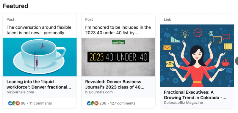 The Featured section allows you to showcase videos, articles, LinkedIn posts, or images that build your credibility.