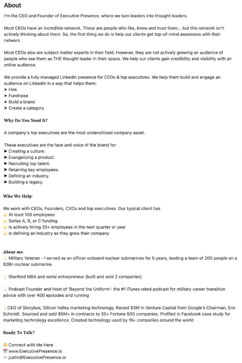 Moreover, describing your company’s activities, achievements, and vision in this section can significantly boost your profile’s impact. Highlight the results you’ve seen and the value your company offers, making a strong case for why potential customers, employees, or investors should engage with you. By telling a compelling story that combines personal and corporate narratives, CEOs can effectively sell both themselves and their companies, leveraging the full potential of their LinkedIn profile to drive meaningful engagement and opportunities.